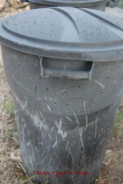 Getting started with composting will take a small initial investment. You’ll first need two plastic trash cans with lids. Mine are the 32-gallon size but as long as you have a minimum of 20 gallons, you should be fine.