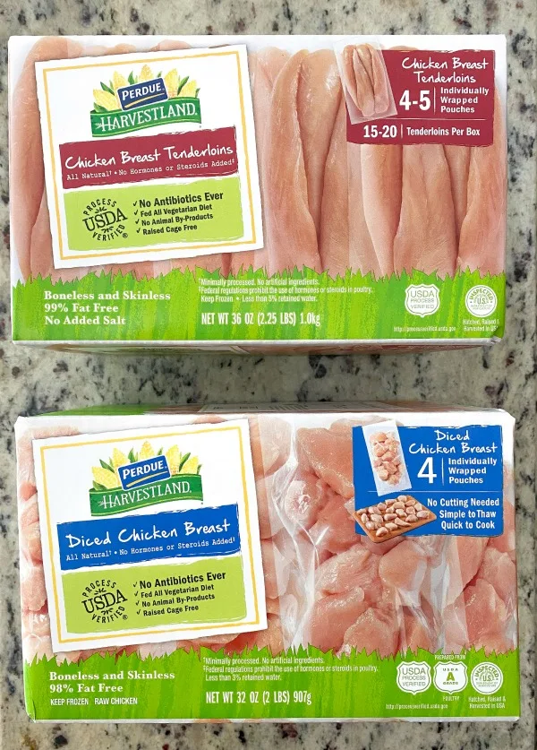 - Perdue Harvestland Boneless Skinless Chicken Breast Tenderloins: these boneless, skinless tenderloins (and their diced counterparts) are great starters for any recipe with chicken. They help you save time since they’re already cut, portioned, and ready to be added fresh or frozen to your favorite chicken recipe from soups and salads to pasta and pizza.