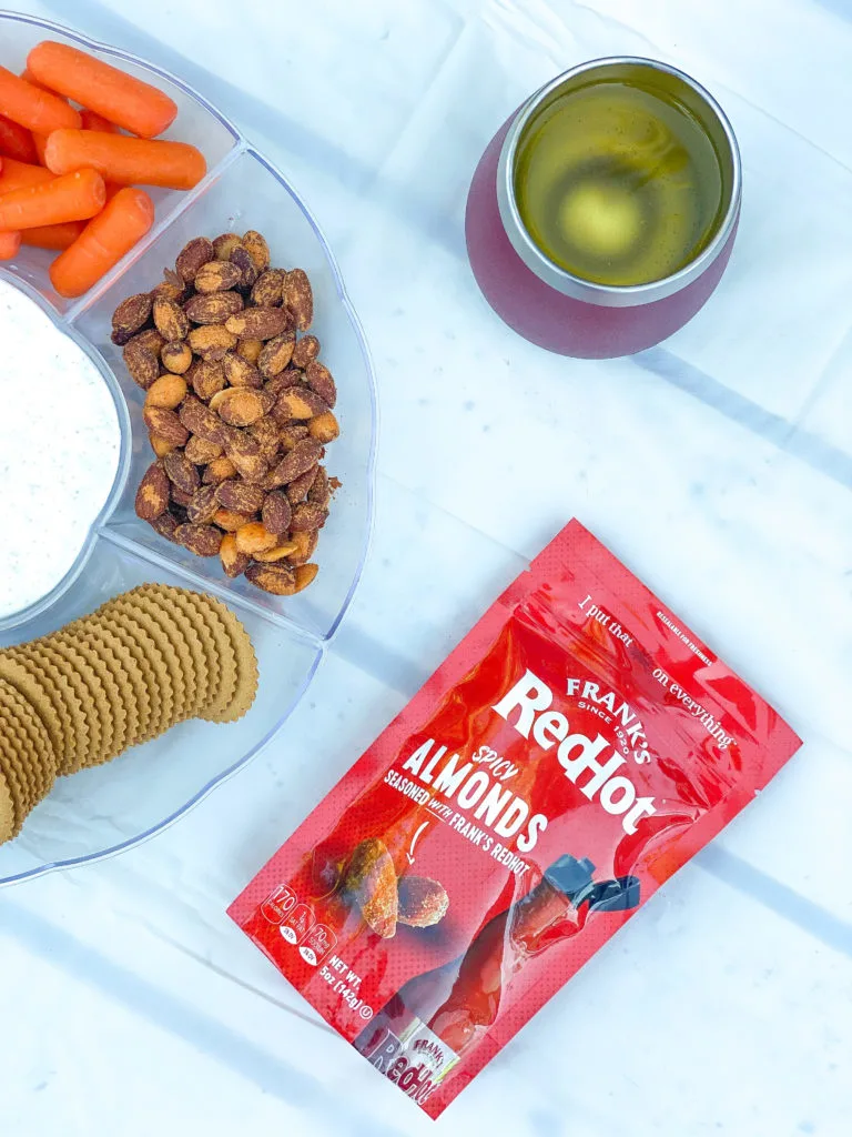 My favorite nuts right now are Franks Red Hot Sauce Almonds. These versatile almonds check the boxes for crunchy, salty, and a little spicy using my favorite wing sauce.