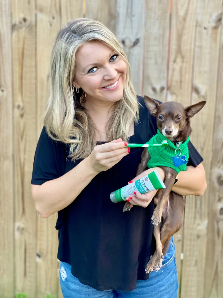 In between cleanings, we’ve always brushed our dog’s teeth with toothbrushes. Sometimes we’d try a special dog toothpaste, but overall our dogs generally hated the stuff so it was just the toothbrush for the most part.