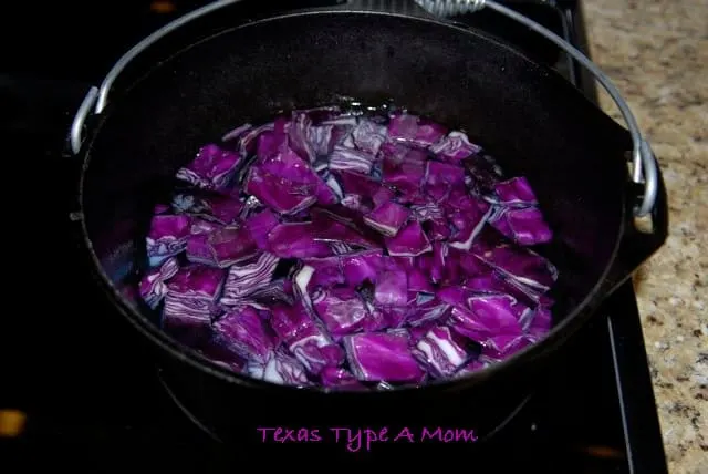 2. Bring 2 cups water to a boil and then add cabbage to pot. Simmer for 10 minutes. The water will turn a deep purple.